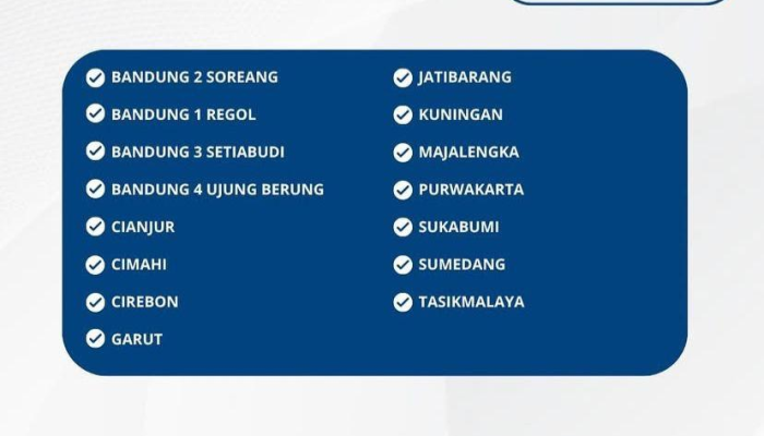 Bandung, Cimahi, Garut, Cirebon, Cianjur, Jatibarang, Kuningan, Majalengka, Purwakarta, Sukabumi, Sumedang, hingga Tasikmalaya!