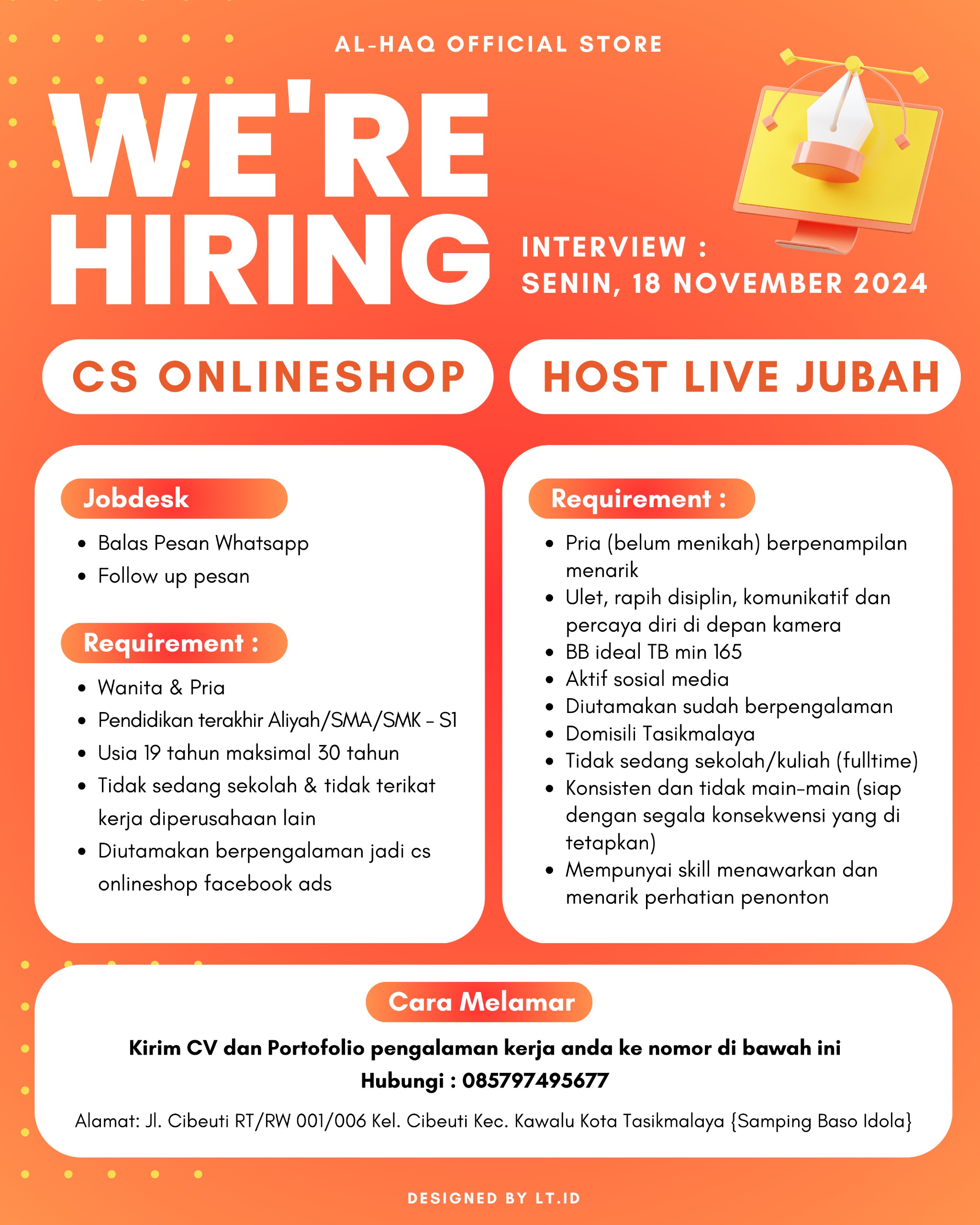 Lokertasikmalaya.ID – Update Info lowongan Kerja 13 November 2024, Lowongan Kerja Al-Haq Official Store