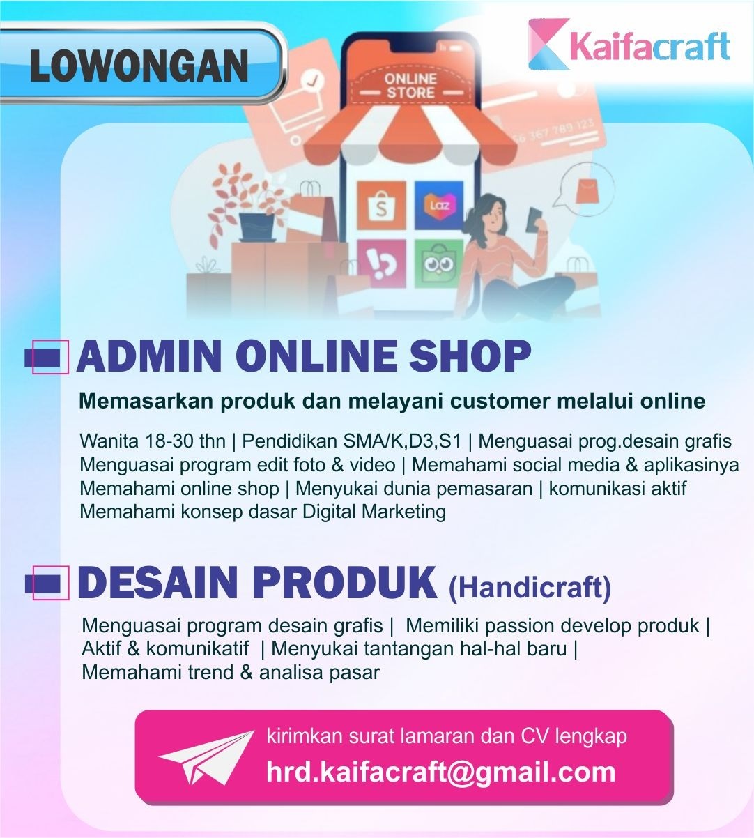 Lokertasikmalaya.ID – Update Info lowongan Kerja 4 Januari 2025, Lowongan Kerja Kaifacraft