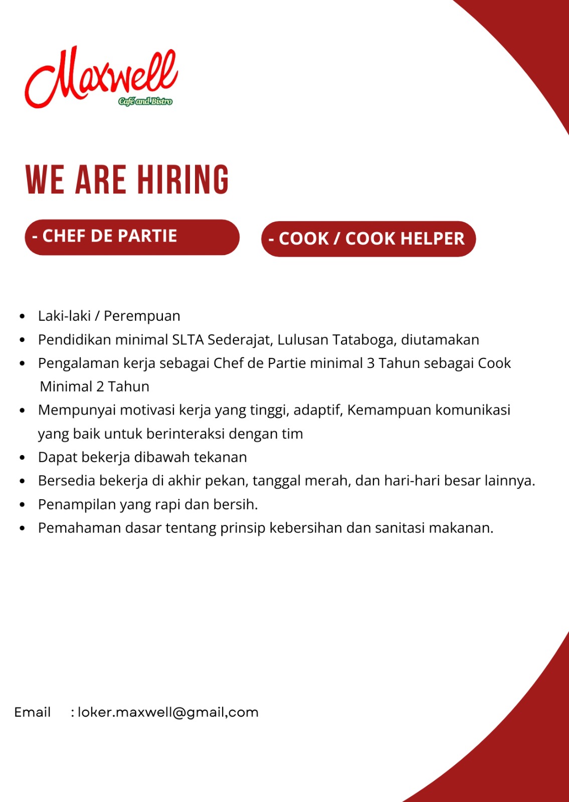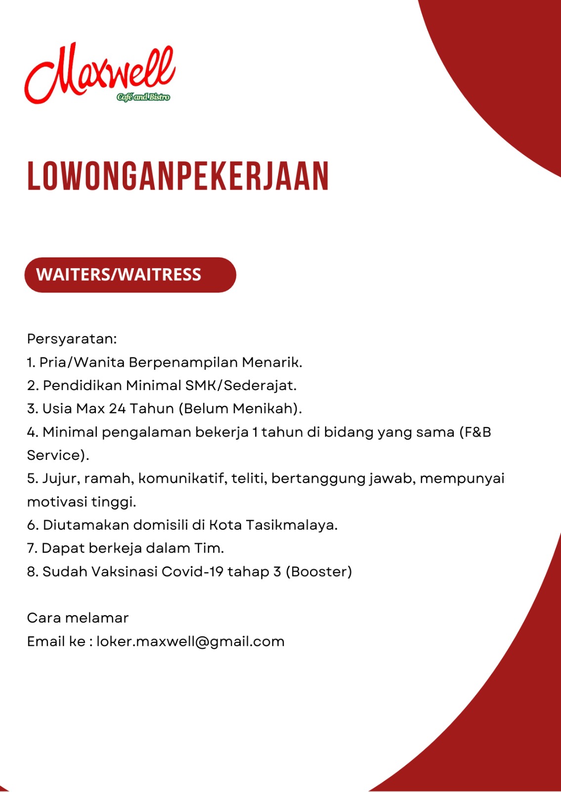 Lokertasikmalaya.ID – Update Info lowongan Kerja 18 Oktober 2024, Lowongan Kerja Maxwell Cafe and Bistro