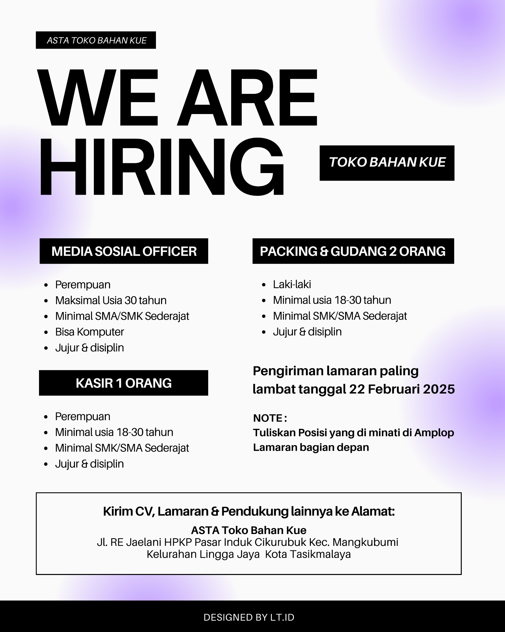 Lokertasikmalaya.ID – Update Info lowongan Kerja 17 Februari 2025 Lowongan Kerja Asta Toko Bahan Kue