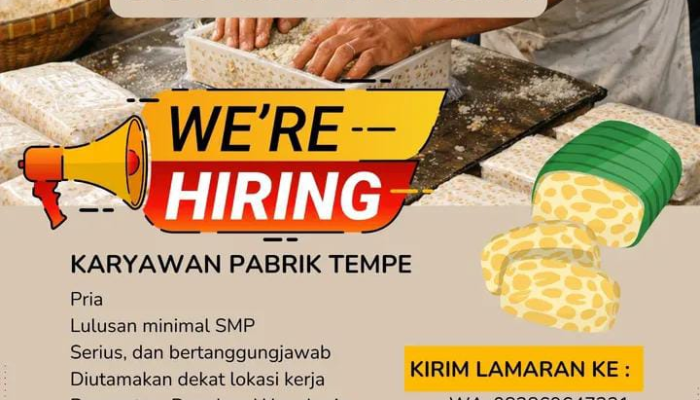 Apakah Anda sedang mencari pekerjaan yang stabil dengan lingkungan kerja yang nyata? Saat ini, sebuah Pabrik Tempe di wilayah Prembun sedang membuka kesempatan bagi Anda untuk bergabung sebagai Karyawan Pabrik. Kami membutuhkan individu yang serius dan berdedikasi untuk membantu proses produksi tempe berkualitas tinggi bagi masyarakat.