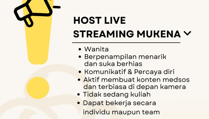 DILSHINE, sebuah brand yang berfokus pada produk mukena, mengundang para wanita yang memiliki bakat dan passion dalam dunia live streaming untuk bergabung dengan tim mereka sebagai Host Live Streaming Mukena. Ini adalah kesempatan emas bagi Anda yang berpenampilan menarik, komunikatif, dan percaya diri untuk menjadi wajah DILSHINE dan mempromosikan produk mukena secara langsung di hadapan audiens. DILSHINE mencari individu yang tidak hanya terampil berbicara, tetapi juga aktif membuat konten media sosial dan mampu bekerja secara mandiri maupun dalam tim.