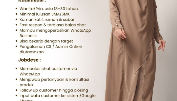 Apakah Anda seorang yang komunikatif, kreatif, dan berdomisili di Tasikmalaya? Inilah kesempatan emas bagi Anda untuk bergabung bersama Hijra Stories, sebuah brand fashion muslim yang terus berkembang dan memberikan dampak positif. Kami sedang membuka lowongan kerja terbaru untuk posisi strategis guna memperkuat tim operasional dan pemasaran kami. Bergabunglah menjadi bagian dari perjalanan kami dalam menghadirkan produk berkualitas bagi masyarakat luas.