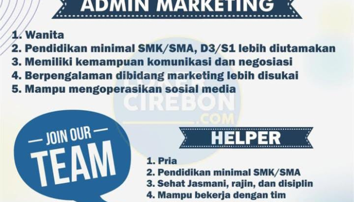 Apakah Anda seorang individu yang dinamis, berorientasi pada hasil, dan siap mengambil peran kunci dalam mengembangkan bisnis di Cirebon? New Delhi Cirebon membuka kesempatan karir bagi talenta terbaik untuk mengisi posisi Admin Marketing dan Helper. Jika Anda memiliki passion dalam bidang pemasaran, mampu mengoperasikan media sosial, atau memiliki semangat kerja keras dan siap ditempatkan di berbagai cabang, segera siapkan CV terbaik Anda. Jadilah bagian dari tim yang bertumbuh pesat di kota Cirebon!
