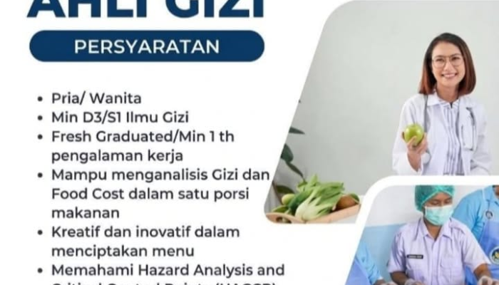 • Pendidikan: Minimal D3/S1 Ilmu Gizi.