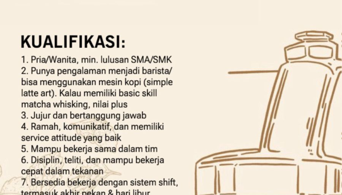 - Memiliki pengalaman menjadi barista atau mampu mengoperasikan mesin kopi.
