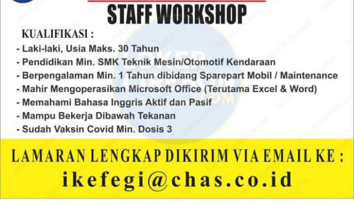 - Pendidikan minimal SMK Teknik Mesin/Otomotif Kendaraan.