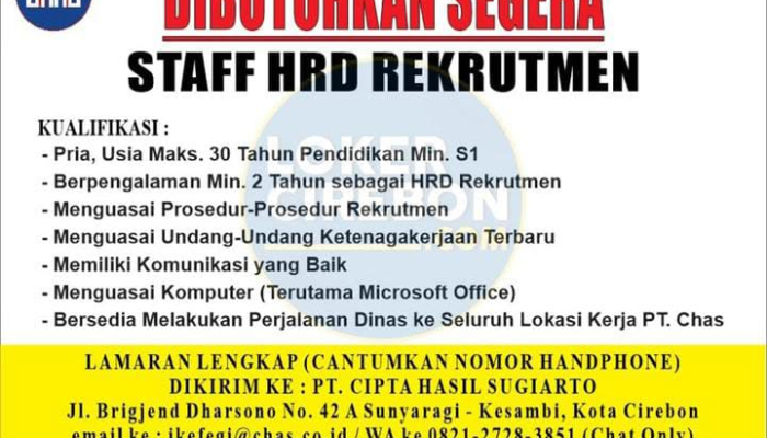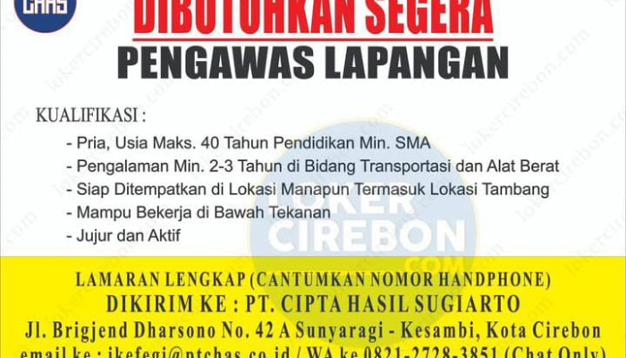 PT Cipta Hasil Sugiarto (PT CHS), salah satu perusahaan terkemuka di Indonesia dalam industri transportasi darat dan penyewaan alat berat, sedang melaksanakan rekrutmen besar-besaran untuk mengisi empat posisi strategis di kantor pusat Cirebon.