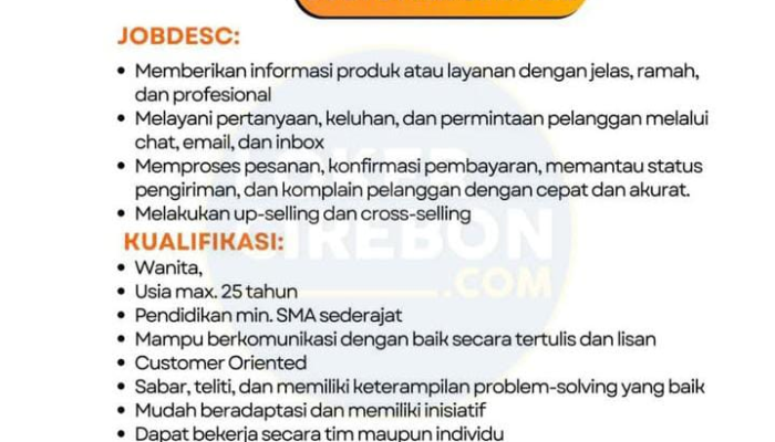 Sedang mencari peluang karir menarik di bidang customer service? Bara Reca membuka kesempatan bagi kamu yang energik dan komunikatif untuk bergabung sebagai Customer Service dengan berbagai keuntungan menarik. Jangan lewatkan kesempatan emas ini untuk berkembang bersama perusahaan yang terus maju di Cirebon!