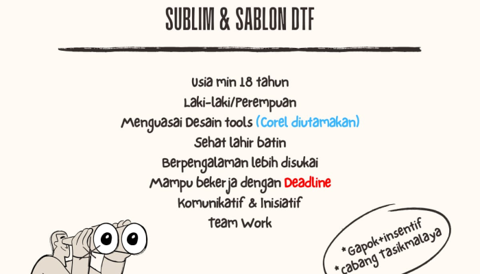 Kami mengundang Anda yang memiliki keahlian desain, terutama dengan Corel, untuk menjadi bagian dari tim di cabang Tasikmalaya. Kami percaya dengan kolaborasi yang solid, kita dapat menghasilkan karya-karya terbaik.