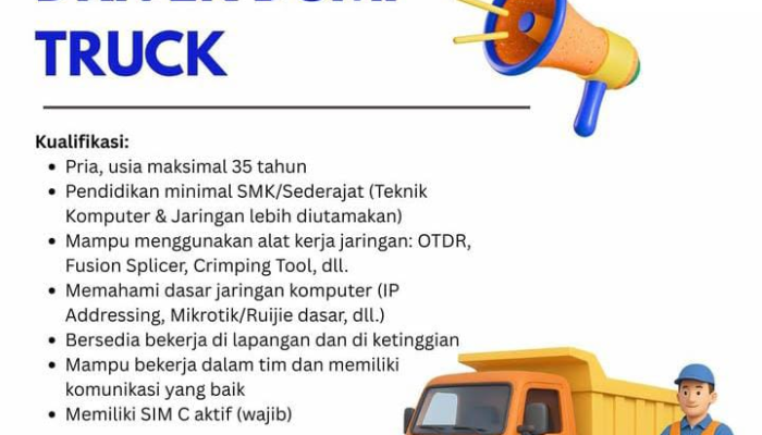 Apakah Anda seorang pengemudi yang terampil, berani bekerja di lapangan, dan memiliki pemahaman dasar tentang jaringan komputer? Lintas Jaringan Nusantara (LJN) membuka peluang karir yang menantang sebagai Driver Dump Truck. Jika Anda memiliki SIM C aktif, lulusan SMK/Sederajat, dan siap berkontribusi dalam proyek jaringan, segera kirimkan lamaran Anda!