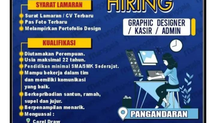 Apakah Anda seorang wanita lulusan SMA/SMK yang terampil dalam desain grafis menggunakan Corel Draw dan Photoshop? Atau Anda memiliki ketelitian tinggi untuk bekerja sebagai Kasir/Admin? Manggala Print membuka kesempatan karir menarik di bidang Graphic Designer, Kasir, dan Admin untuk penempatan di Pangandaran. Jika Anda berdomisili di sekitar Pangandaran, berpenampilan menarik, santun, dan siap bekerja dalam tim, segera raih peluang ini! Simak detail lengkap loker terbaru di bidang percetakan ini.