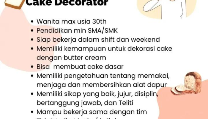 • Khusus Cake Decorator: Memiliki kemampuan dekorasi menggunakan butter cream dan pengetahuan tentang alat dapur.