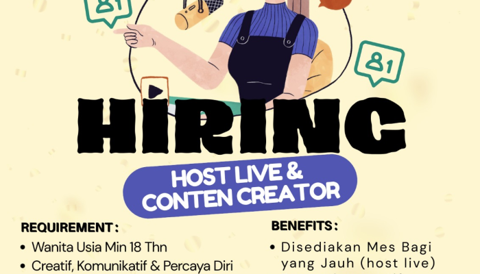 Posisi Host Live & Conten Creator ini adalah peran ganda yang membutuhkan kemampuan public speaking dan skill editing dasar.