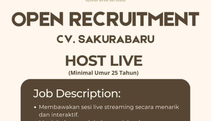 Anda memiliki kemampuan berbicara di depan kamera dengan menarik dan interaktif? Sakura Baru sedang membuka kesempatan untuk posisi Host Live dengan penempatan di Tasikmalaya! Jika Anda berusia minimal 25 tahun dan siap untuk menjelaskan produk serta berinteraksi dengan audiens secara langsung, ini adalah kesempatan Anda untuk bergabung!