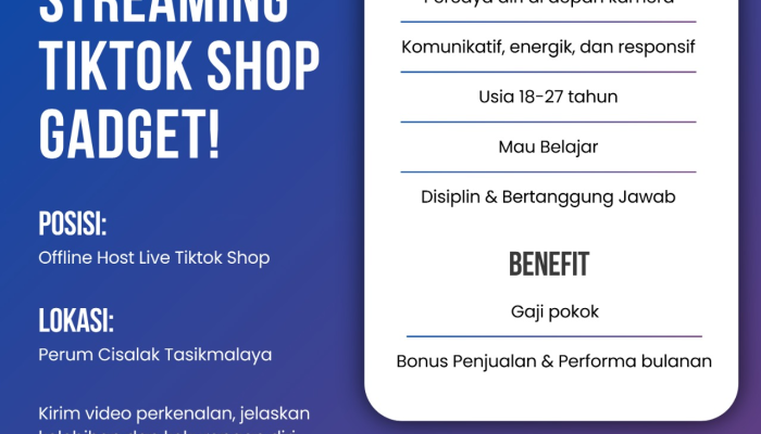 Apakah Anda muda, energik, dan memiliki bakat komunikasi yang luar biasa? Inilah kesempatan emas bagi Anda yang berusia 18 hingga 27 tahun untuk menjadi Offline Host Live TikTok Shop Gadget di area Tasikmalaya! Kami mencari individu yang percaya diri di depan kamera, responsif, dan siap menjadi wajah brand kami dalam mempromosikan produk-produk gadget terbaru. Jika Anda bersemangat untuk meraih gaji pokok plus bonus penjualan yang besar, segera kirimkan CV dan video perkenalan Anda!