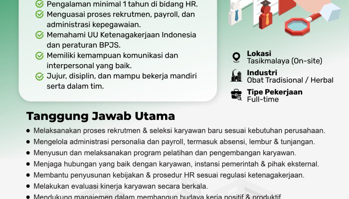 Kami mencari individu dengan pendidikan minimal S1 yang jujur, disiplin, dan memiliki pengalaman HR minimal 1 tahun. Dapatkan Gaji Kompetitif sesuai pengalaman dan kesempatan untuk berkembang bersama perusahaan yang sedang tumbuh pesat. Jika Anda siap menjadi pilar dalam membangun budaya kerja yang positif dan produktif, simak detail lengkapnya di bawah ini!