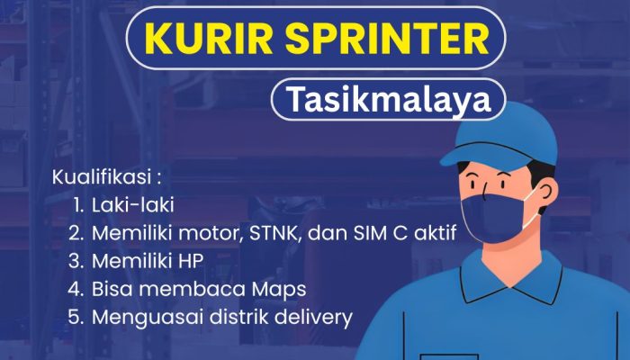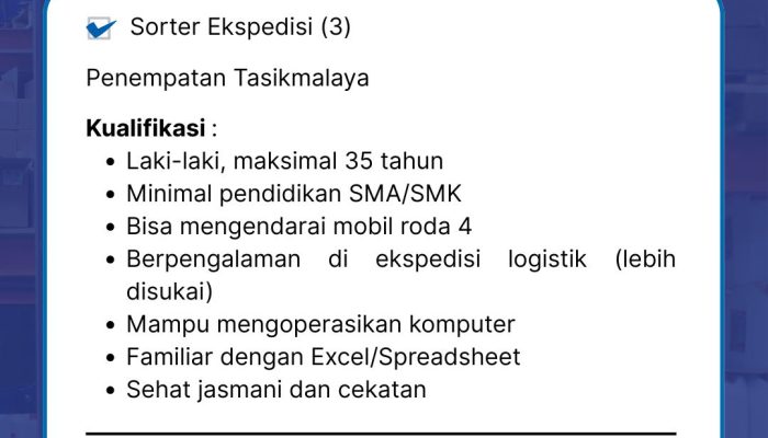 Jika Anda memenuhi kualifikasi di atas untuk posisi Kurir Sprinter atau Sorter Ekspedisi di Tasikmalaya, segera kirimkan CV Anda.