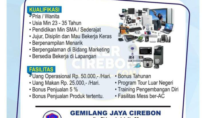 GEMILANG JAYA CIREBON membuka peluang emas bagi Anda untuk bergabung sebagai tenaga Marketing Lapangan. Kami mencari individu Pria/Wanita yang berdomisili di wilayah Cirebon, Indramayu, Majalengka, dan Kuningan (Ciayumajakuning). Jika Anda memenuhi kualifikasi, jujur, disiplin, dan memiliki semangat kerja keras, segera manfaatkan kesempatan loker Marketing terbaru ini untuk meningkatkan karir dan kesejahteraan Anda!