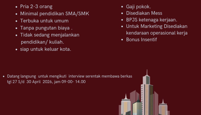 - Walk-In Interview (Datang Langsung): Silakan datang membawa berkas lamaran lengkap pada tanggal 27 s/d 30 April 2026, jam 09:00 – 14:00 WIB.