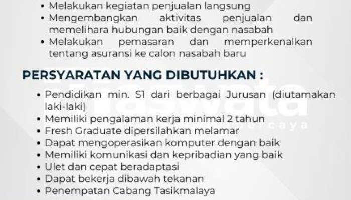 Aswata (Asuransi Terpercaya), sebuah perusahaan asuransi terkemuka, membuka kesempatan bagi Anda untuk bergabung sebagai Marketing Staff dengan penempatan di Cabang Tasikmalaya. Jika Anda siap mengembangkan aktivitas penjualan asuransi dan menjalin hubungan baik dengan nasabah, segera kirimkan lamaran terbaik Anda!