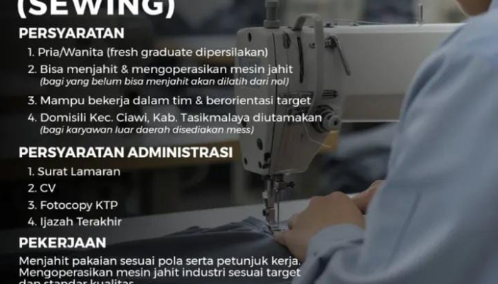 Apakah Anda sedang mencari peluang karir di industri garmen yang stabil dan suportif? Inilah kesempatan Anda! DMS Tasikmalaya membuka lowongan kerja terbaru untuk posisi Operator Jahit (Sewing). Kami mengundang tenaga kerja yang bersemangat, baik yang sudah berpengalaman maupun yang baru lulus (fresh graduate), untuk tumbuh dan berkembang bersama tim kami di wilayah Ciawi, Tasikmalaya.