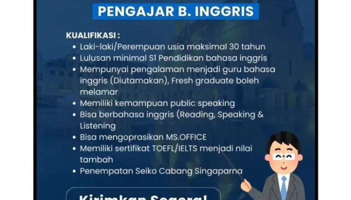 Apakah Anda seorang pendidik yang bersemangat, memiliki penguasaan Bahasa Inggris yang mumpuni, dan siap mendedikasikan diri dalam dunia pengajaran? Seiko Cabang Singaparna membuka peluang karir emas sebagai Pengajar Bahasa Inggris. Kami mengundang para lulusan S1 Pendidikan Bahasa Inggris yang memiliki kemampuan public speaking dan siap menginspirasi generasi muda. Ini adalah kesempatan Anda untuk bergabung dengan institusi pendidikan terkemuka di Singaparna. Segera kirimkan lamaran Anda sebelum tanggal penutupan! Simak detail lengkap loker guru terbaru ini.