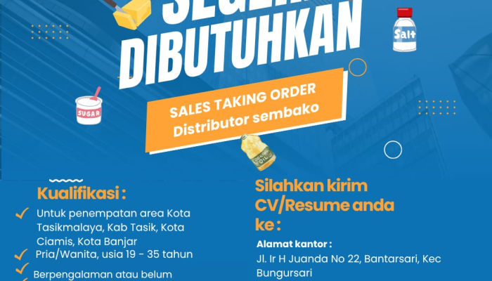 PT Citra Inti Priangan, distributor sembako terkemuka, sedang mencari kandidat terbaik untuk posisi Sales Taking Order. Kami membuka kesempatan bagi Anda, baik yang sudah berpengalaman maupun yang baru ingin memulai karir, untuk bergabung dan bertumbuh bersama kami. Jika Anda memiliki niat serius untuk berwirausaha/bekerja dan siap menghadapi tantangan, segera baca detail lowongan dan cara melamar di bawah ini!