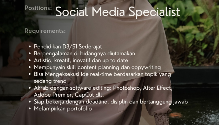 Kami mengundang Anda yang memiliki passion tinggi dalam content planningcopywriting, dan mahir mengoperasikan berbagai software editing (seperti Photoshop, After Effect, CapCut, dll.) untuk segera melamar. Jika Anda siap bekerja secara inovatif dan mampu mengeksekusi ide real-time berdasarkan tren terkini, ini adalah kesempatan emas untuk berkontribusi pada pertumbuhan brand yang dinamis. Simak kualifikasi lengkap dan cara melamar di bawah ini!