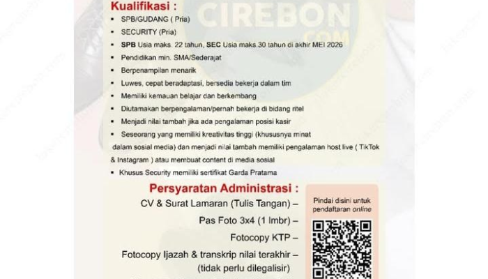 - Security: Pria, usia maksimal 30 tahun (di akhir Mei 2026) dan wajib memiliki Sertifikat Garda Pratama.