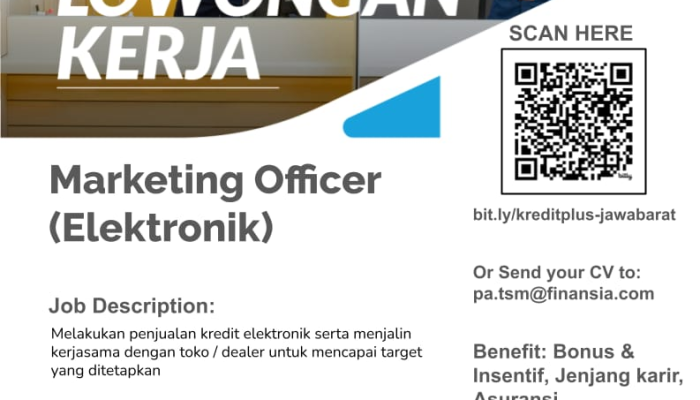 Apakah Anda seorang fresh graduate yang bersemangat atau individu berpengalaman di bidang marketing yang mencari tantangan baru? Ingin berkontribusi dalam memajukan penjualan kredit elektronik di salah satu perusahaan pembiayaan terkemuka? Inilah kesempatan emas yang Anda tunggu! PT KB Finansia Multi Finance, yang dikenal dengan brand Kreditplus, membuka peluang karir sebagai Marketing Officer (Elektronik) di area Tasikmalaya. Segera siapkan diri Anda, karena kesempatan untuk mengembangkan karir gemilang di industri pembiayaan ini sudah di depan mata!