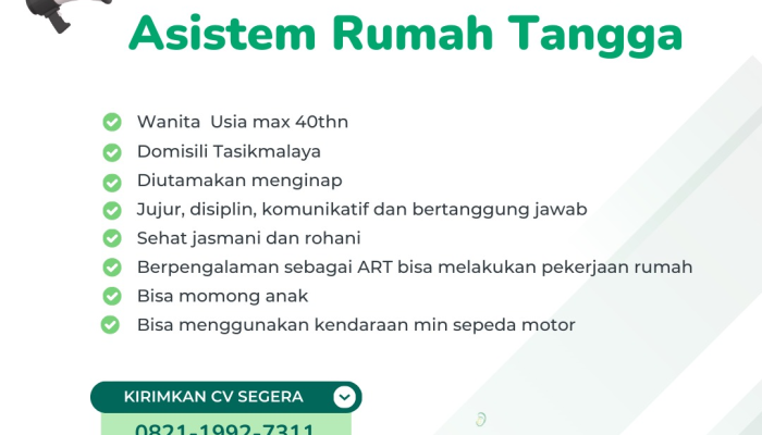 Apakah Anda berdomisili di Tasikmalaya dan mencari kesempatan kerja yang menantang dan bermanfaat di sektor kesehatan atau pelayanan domestik? Rumah Sahabat Bidan membuka dua posisi penting: Tenaga Apoteker profesional dan Asisten Rumah Tangga yang handal. Jika Anda menjunjung tinggi kejujuran, disiplin, dan bertanggung jawab, kami mengundang Anda untuk segera bergabung. Jangan lewatkan batas pengumpulan CV pada 17 Desember 2025!