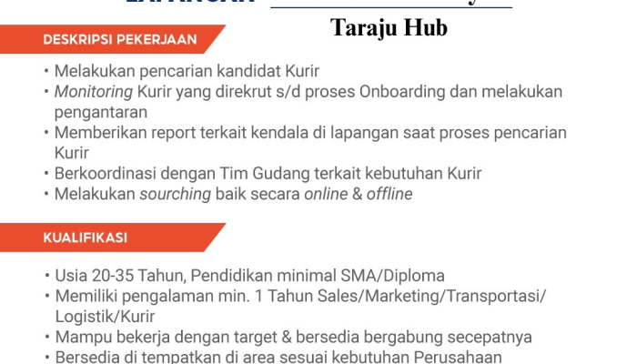 - Pengalaman: Memiliki pengalaman kerja minimal 1 Tahun di bidang Sales, Marketing, Transportasi, Logistik, atau sebagai Kurir.