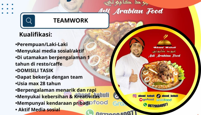 Abood Kebuli, penyedia Authentic Arabian Food yang sedang hits, kini membuka kesempatan emas bagi Anda yang bersemangat, kreatif, dan siap bekerja dalam tim. Kami mencari individu yang dinamis untuk mengisi posisi Team Work di lokasi Tasikmalaya.