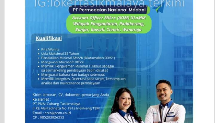 PT Permodalan Nasional Madani (PNM) kembali membuka kesempatan berkarier bagi putra-putri terbaik Indonesia. Saat ini tersedia lowongan kerja Account Officer Mikro (AOM) ULaMM untuk wilayah Pangandaran, Padaherang, Banjar, Kawali, Ciamis, dan Wanareja. Posisi ini cocok bagi Anda yang memiliki minat di bidang pembiayaan mikro, pemasaran, serta pemberdayaan UMKM.