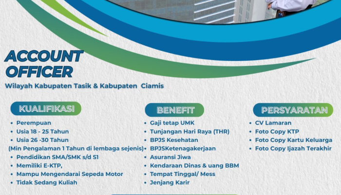 Peluang emas bagi para perempuan tangguh di wilayah Kabupaten Tasikmalaya dan Kabupaten Ciamis untuk berkarir sekaligus memberdayakan sesama! PT Permodalan Nasional Madani (PNM), sebuah Badan Usaha Milik Negara (BUMN) terkemuka, membuka lowongan kerja untuk posisi Account Officer (AO) untuk program Mekaar.