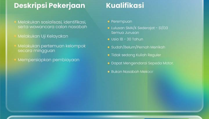 Bergabunglah bersama keluarga besar PNM MUM dan jadilah bagian dari agen perubahan ekonomi nasional! Kami mengundang Anda, para talenta muda yang bersemangat, untuk mengisi posisi Account Officer dengan wilayah kerja yang luas di Priangan Timur. Jika Anda menyukai pekerjaan lapangan, senang berinteraksi dengan masyarakat, dan ingin memiliki jenjang karir yang pasti, inilah saat yang tepat untuk mendaftar.