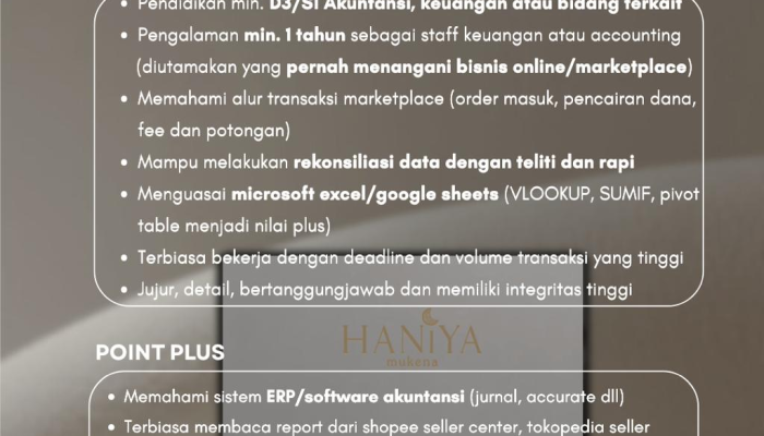 Apakah Anda seorang profesional di bidang keuangan yang sedang mencari tantangan baru di industri e-commerce? Ini adalah kesempatan emas bagi Anda! Haniya Mukena, salah satu brand mukena ternama yang terus berkembang pesat, kini membuka pintu bagi talenta berbakat untuk bergabung sebagai staf Accounting.
