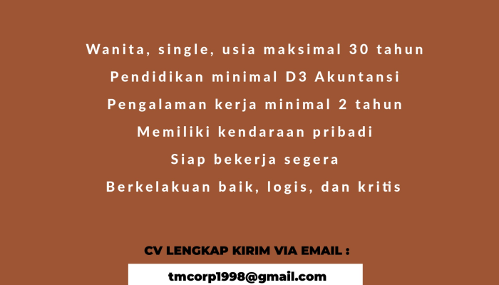 - Pendidikan: Minimal lulusan D3 Akuntansi.