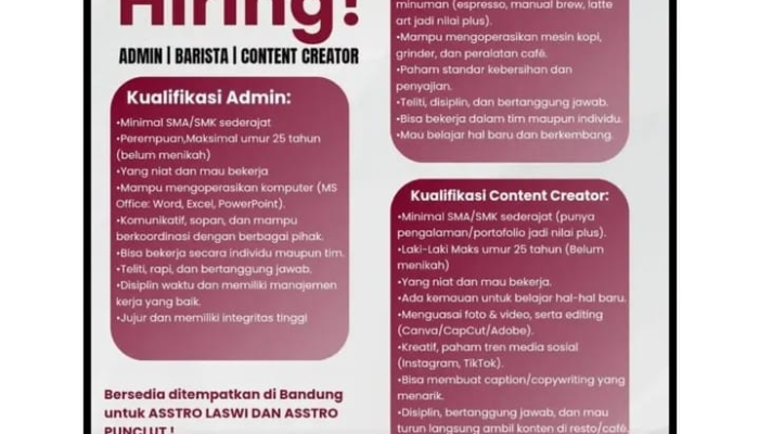 Lowongan Kerja Admin, Barista, dan Content Creator di ASSTRO Bandung