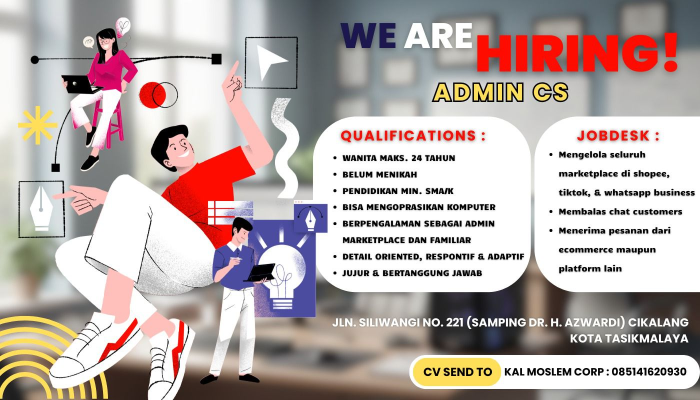 Apakah Anda seorang wanita muda yang teliti, komunikatif, dan mahir mengoperasikan platform marketplace? KAL Moslem Corp saat ini sedang membuka kesempatan karier menarik untuk posisi Admin CS bagi Anda yang berdomisili di Tasikmalaya dan sekitarnya.