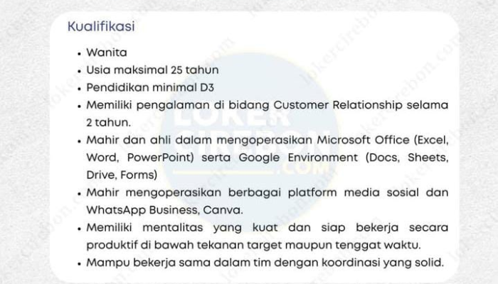 - Pengalaman: Memiliki pengalaman di bidang Customer Relationship minimal selama 2 tahun.