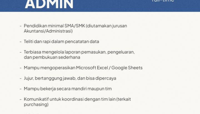 - Pendidikan: Minimal SMA/SMK (diutamakan lulusan jurusan Akuntansi atau Administrasi).