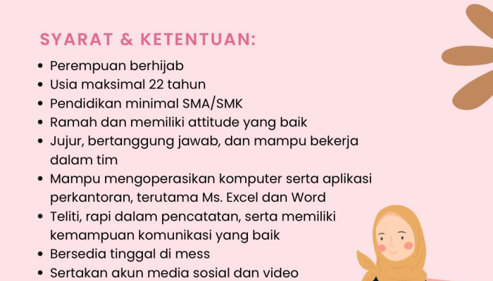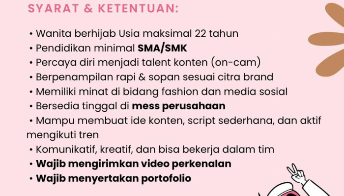 - Jenis Kelamin & Usia: Wanita berhijab, usia maksimal 22 tahun.