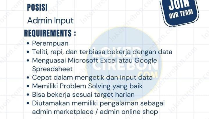 Apakah Anda seseorang yang sangat detail, teliti, dan terbiasa bekerja dengan data? Kami sedang membuka kesempatan bagi Anda untuk bergabung sebagai Admin Input dalam tim kami yang dinamis. Jika Anda menguasai pengolahan data menggunakan spreadsheet dan mencari tantangan baru di dunia administrasi, lowongan ini adalah jawaban yang Anda cari!