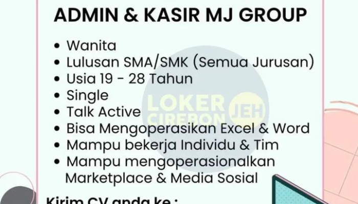 Apakah Anda seorang wanita muda yang aktif, komunikatif, dan sedang mencari peluang karir di bidang administrasi dan retail? MJ Group saat ini sedang membuka lowongan kerja untuk posisi Admin & Kasir untuk ditempatkan di wilayah Cirebon. Kami mencari talenta yang mampu bekerja secara mandiri maupun dalam tim untuk bergabung dalam lingkungan kerja yang dinamis.