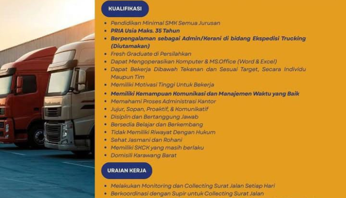- Pengalaman: Berpengalaman sebagai Admin/Kerani di bidang ekspedisi trucking (diutamakan), namun lulusan baru (Fresh Graduate) dipersilakan melamar.