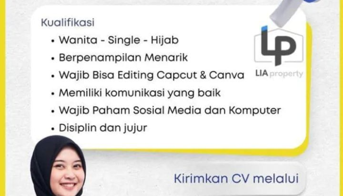 Mencari karir di bidang administrasi dan marketing yang dinamis? Lia Property membuka peluang emas bagi Anda untuk bergabung sebagai Admin Marketing. Jika Anda seorang wanita yang berpenampilan menarik, menguasai media sosial dan editing video, serta memiliki jiwa yang jujur dan disiplin, ini adalah saat yang tepat untuk menunjukkan potensi terbaik Anda. Bergabunglah dengan kami dan kembangkan karir profesional Anda di lingkungan kerja yang produktif.