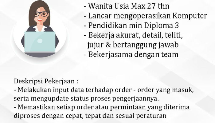 Kami membuka kesempatan karir bagi individu yang teliti dan bertanggung jawab untuk mengisi posisi Admin Marketplace. Jika Anda seorang wanita yang mahir mengoperasikan komputer dan mampu bekerja secara akurat, kami mengundang Anda untuk bergabung dengan tim kami.